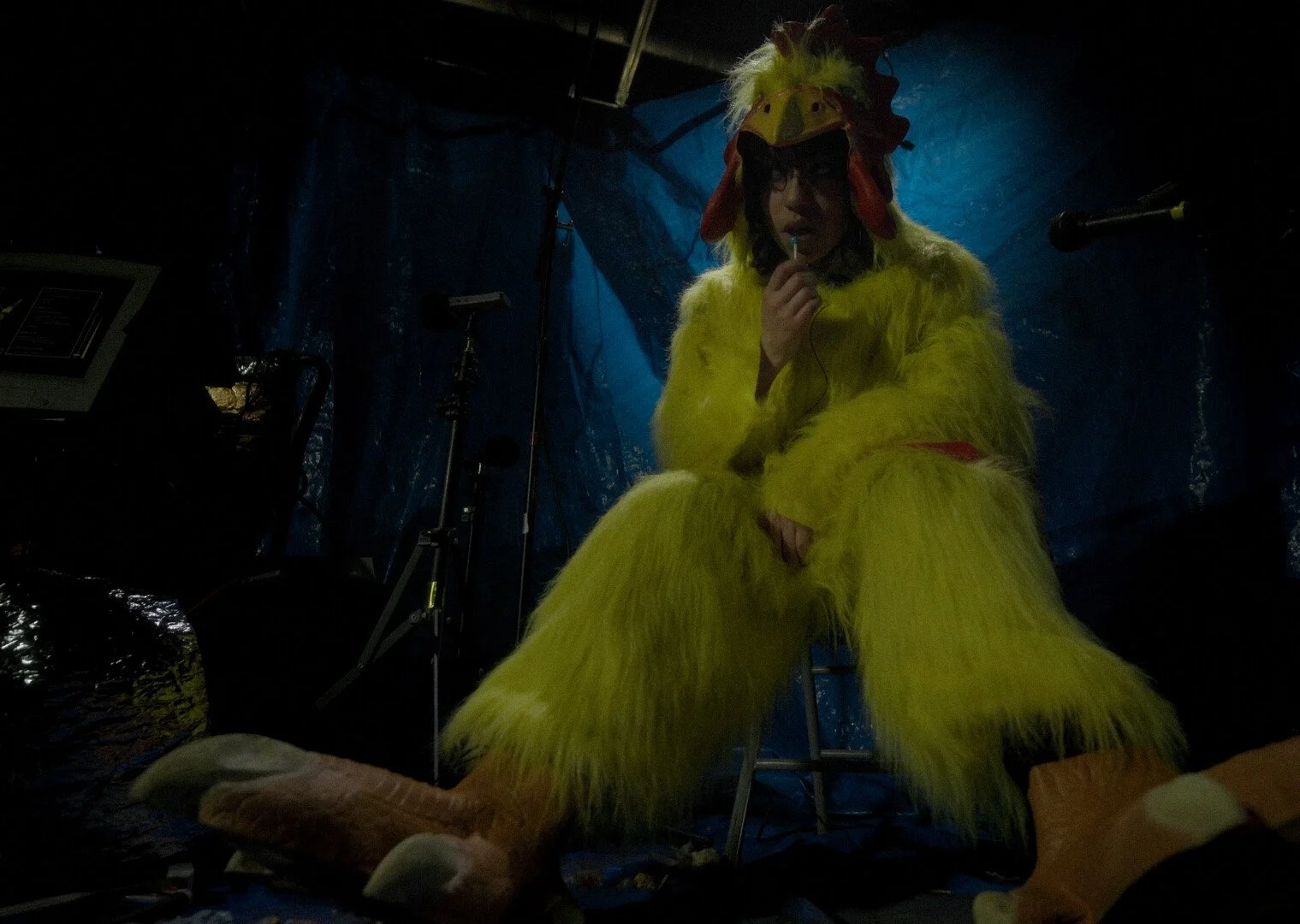 A woman who fell into a pit of tar has to maintain her optimism when a chicken tries to make fun of her.